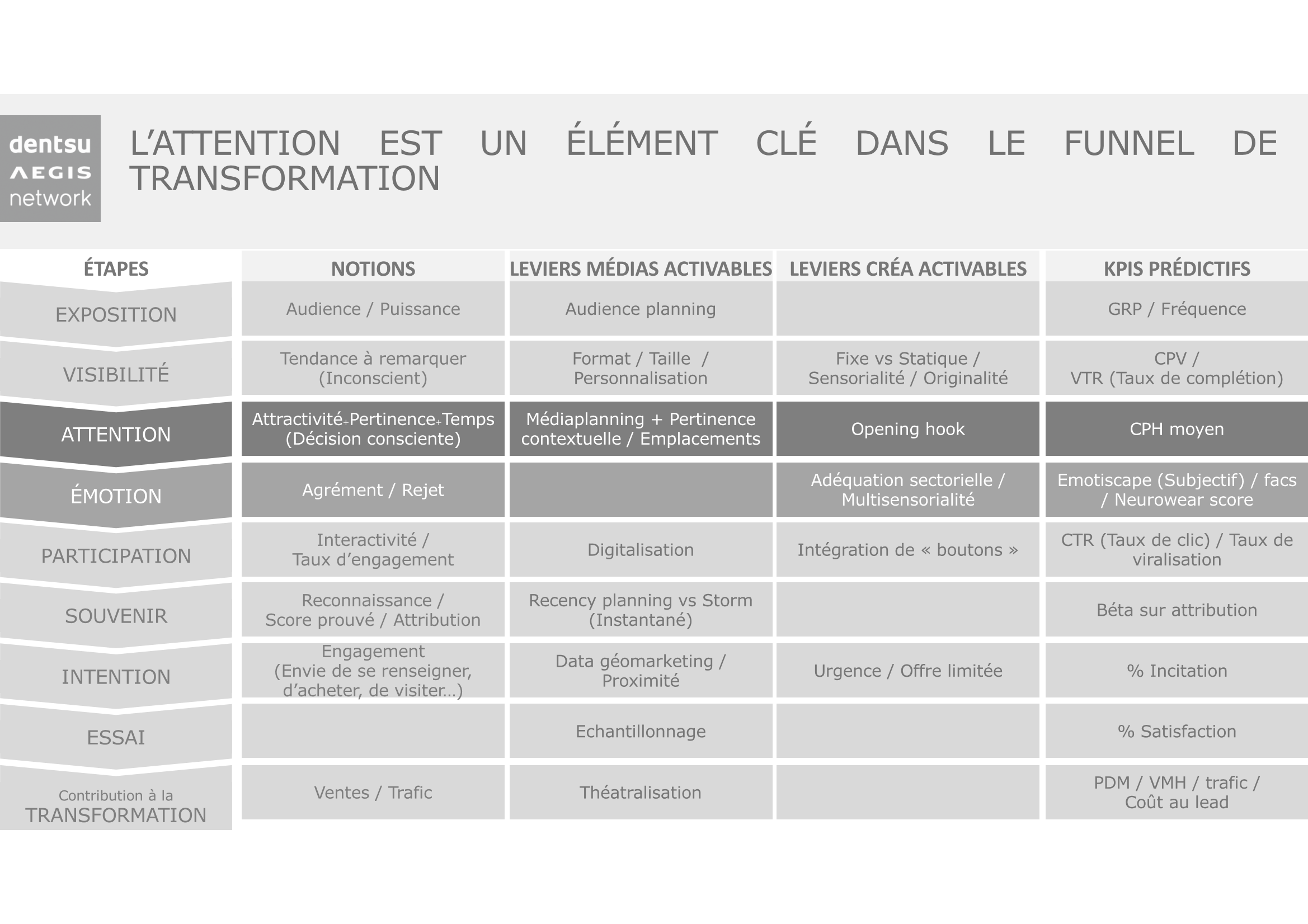 Reste un problème de fond : comment mesurer l’attention ? Les KPI sont nécessaires à chaque étape du process, mais la « brique » de l’attention reste très complexe. Nous allons y revenir.