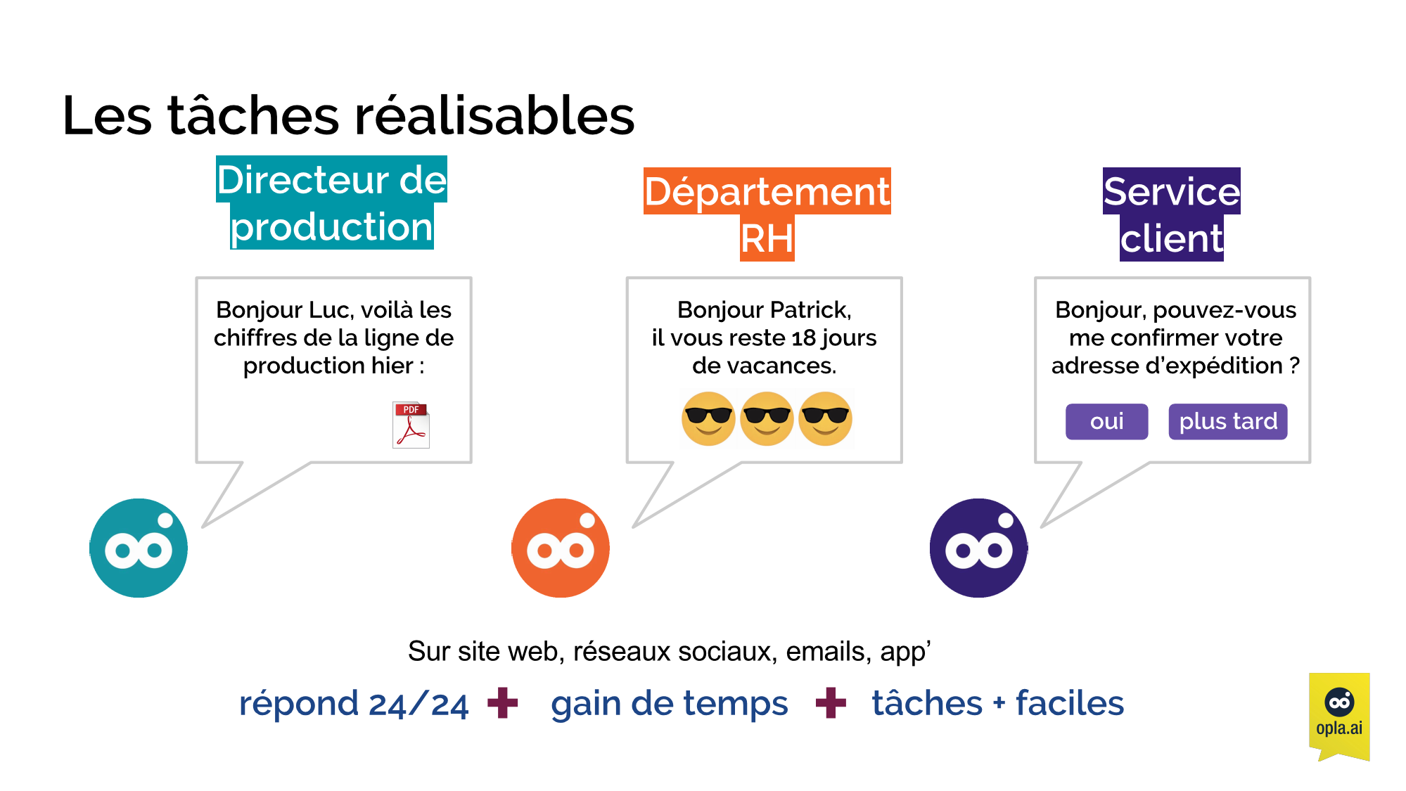 Il vous manque une information ? Le chatbot pourra facilement vous informer au niveau du service clientèle. Vous rencontrez un problème de faible niveau sur votre chaîne de production? Opla peut vous apporter l’information qui pourra vous permettre de réparer la panne et jouera le rôle d’un Directeur de production. Vous souhaitez savoir quand est-ce que se situe les dates de vos congés? Demandez à Opla et sa compétence RH.