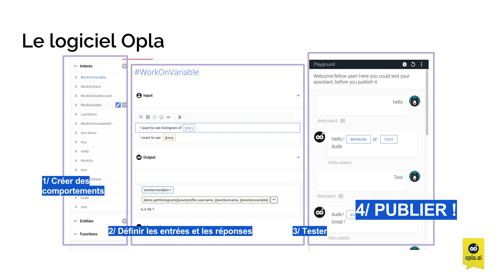 Opla ne bouscule pas les habitudes, mais s’intègre à elles. Ils se positionne sur la data connues des salariés et des entreprises. Il ne nécessite donc aucune interface spécifique. Opla est codé entièrement en interne et se défend d’être, simple d’utilisation, doté d’un système de protection des données sécurisant. Mais a quoi ressemble Opla?