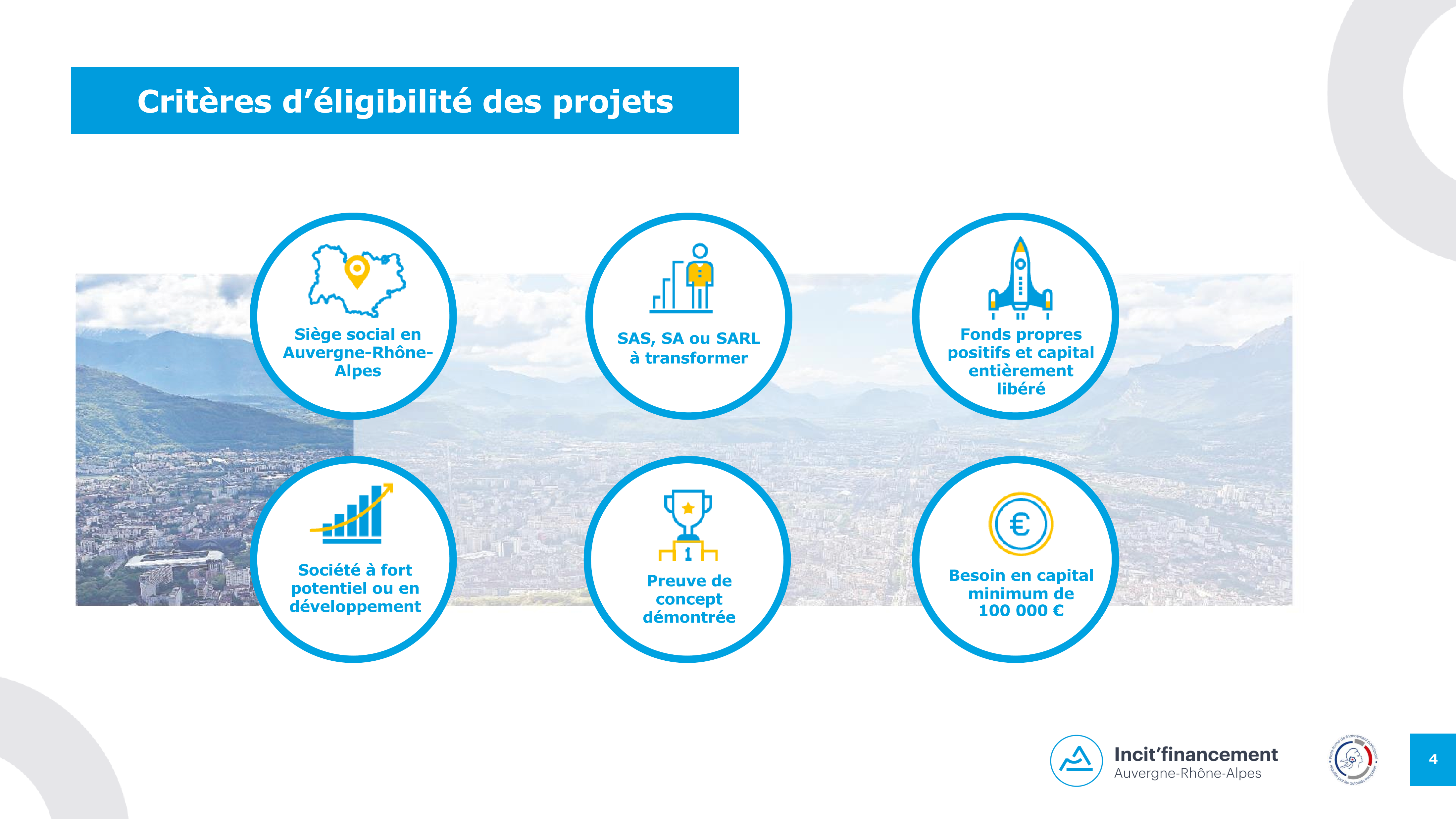 Les projets retenus sont impérativement basés dans la région Auvergne-Rhône-Alpes, et doivent suivre les critères suivants :