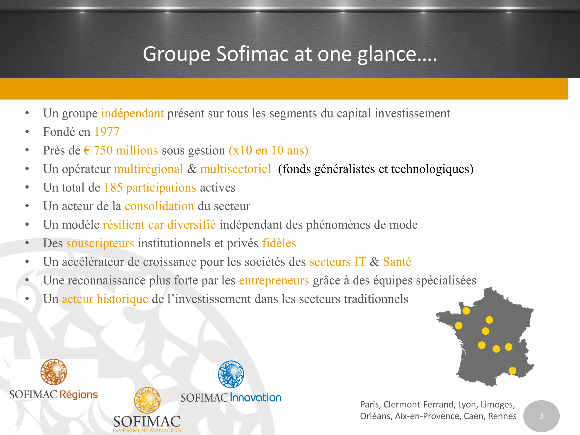 Le groupe Sofimac est un groupe indépendant, auvergnat d’origine – le siège est implanté à Clermont – fondé en 1977. L’opérateur aujourd’hui multirégional pèse 750 millions d’euros, avec 185 participations actives. Il parie sur l’ancrage régional et la proximité avec les écosystèmes territoriaux, tout en proposant des “véhicules financiers” diversifiés et adaptables pour répondre aux besoins des acteurs (capital risque / capital développement).