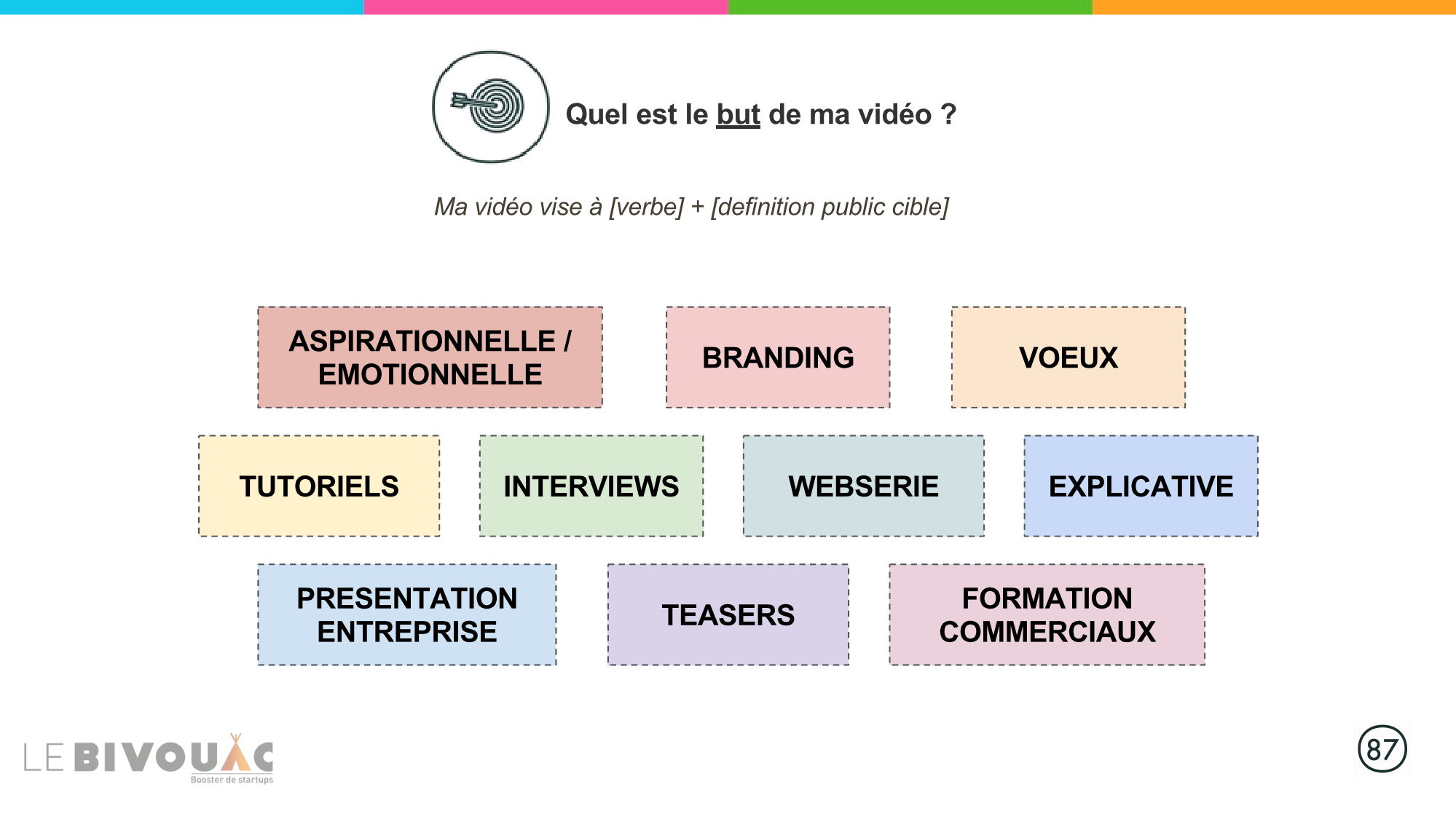 - Quel est l’objectif, quelle est la cible ? Règle centrale: une vidéo = un message. L’objectif et la cible peuvent être synthétisés dans une phrase du type « ma vidéo vise à … pour … » (ex: « ma vidéo vise à éduquer mes clients, ma vidéo vise à fidéliser mes investisseurs » …)