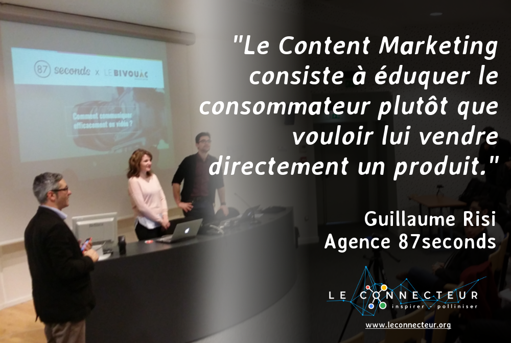 Une présentation de l’agence 87seconds à Lyon (Guillaume Risi, chef de projet – anciennement Michelin – et Eloïse Raillard, responsable d’agence). 50 personnes en tout, au niveau européen (siège social à Bruxelles). La spécificité de l’agence est d’avoir internalisé tous les talents, de la vidéo pure à la 3D et au son. Elle a 4 ans d’existence, autour du challenge de vidéos créatives et « uniques ».