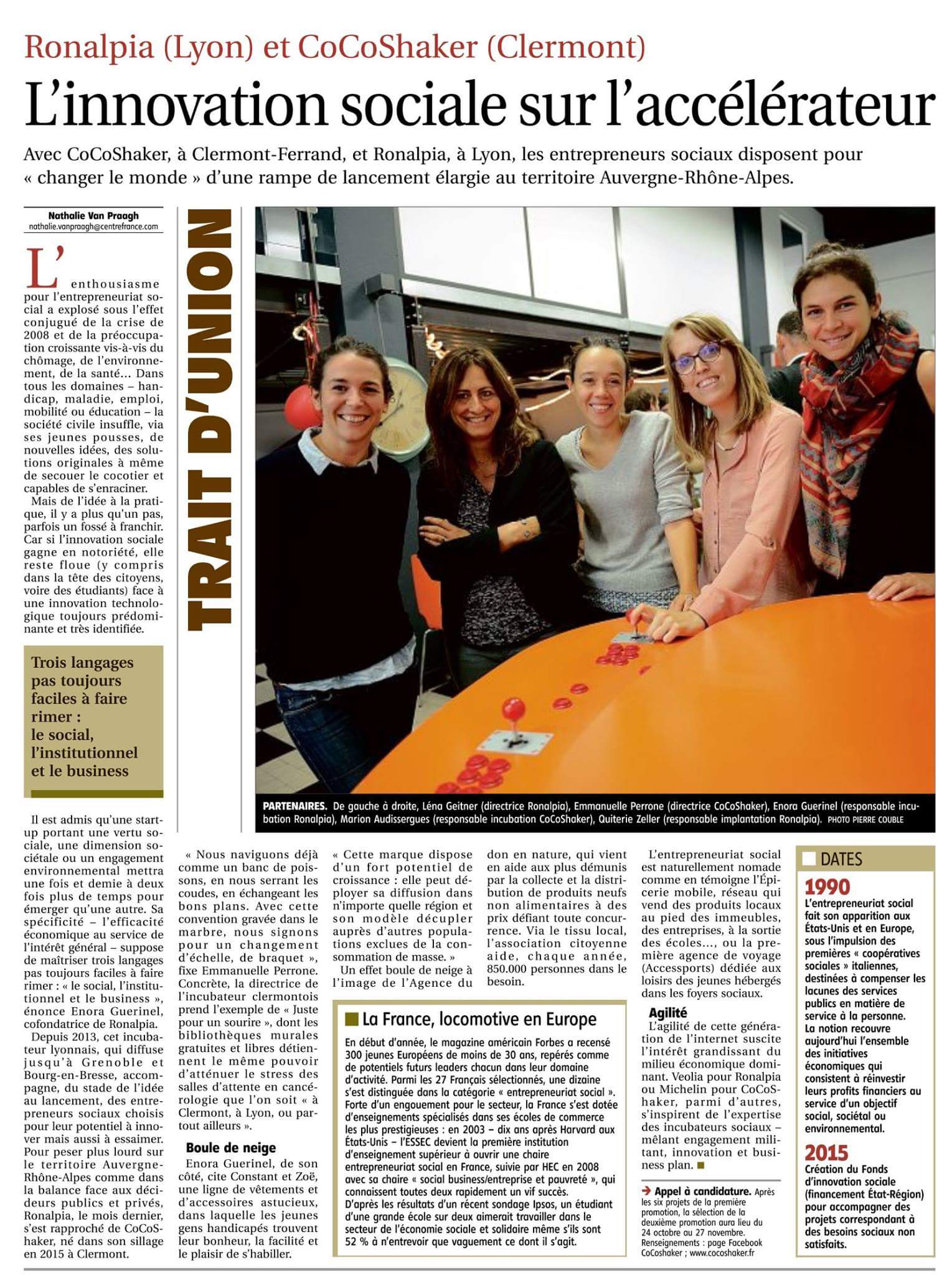 • Enfin, un bel article paru ce week-end et que nous avons complètement zappé  – pardon aux amis de Epicentre – sur l’entrepreneuriat social entre Clermont et Lyon (avec Ronalpia) – introuvable en ligne (cf. visuel ci-dessous)
